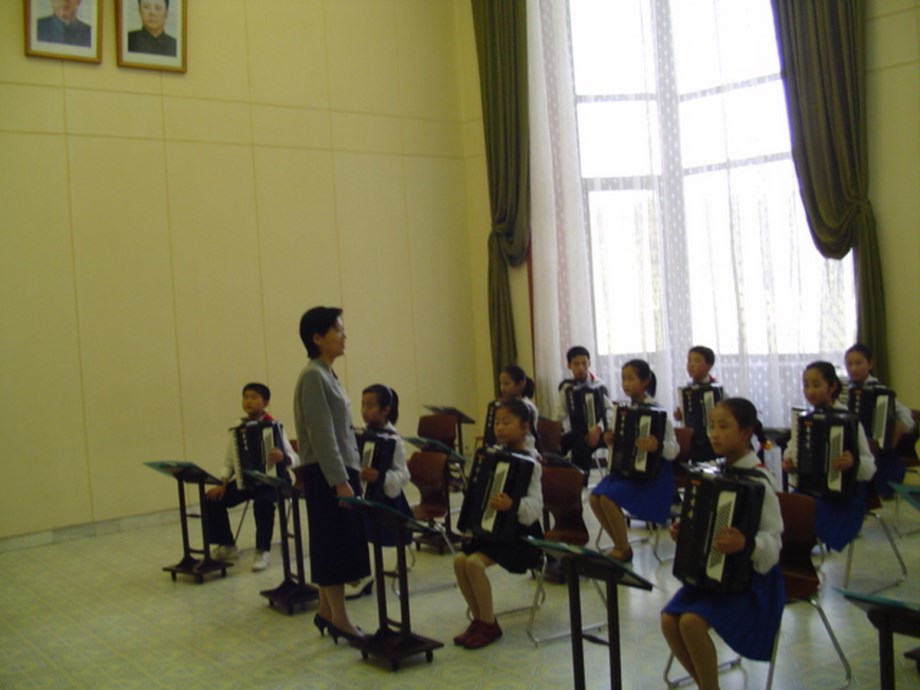 jesteśmy lekko spóźnieni, przebiegamy przez sale gdzie urocze małe dziewczynki pod okiem wodza wiszącego na ścianie, grają na instrumentach, jest ładnie i ciekawie, wychodzimy idziemy dalej w kolejnej sali już trochę starsza młodzież, również pod okiem nauczycieli gra na akordeonach, wszystkie dzieci bardzo poważne.