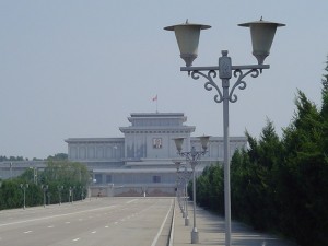 Ruszyliśmy dalej, po drodze zatrzymaliśmy się przy mauzoleum Kim Ir Sena, zupełnie pusta droga, wymarła, stanęliśmy na dwie minuty i kazano nam zrobić zdjęcia, na pytanie dlaczego nie zabierają nas do środka odpowiedzieli że tylko w soboty wpuszczają obcokrajowców, mi się jednak wydaje, iż nie byliśmy godni, cały czas chodziliśmy w klapkach krótkich spodenkach, a z tego co widziałem tam tylko w garniturze wpuszczają, pewnie nie byliśmy pewni i poprawni politycznie.